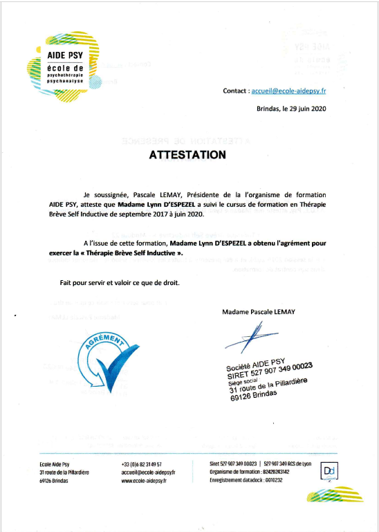- Juin 2020 : Agrément en Psychothérapie Brève TBSI (Ecole Aide-Psy)