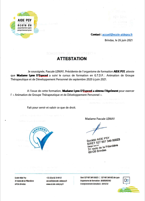 - Juin 2021 : Agrément en Animation de Groupe Thérapeutique (Ecole Aide-Psy)