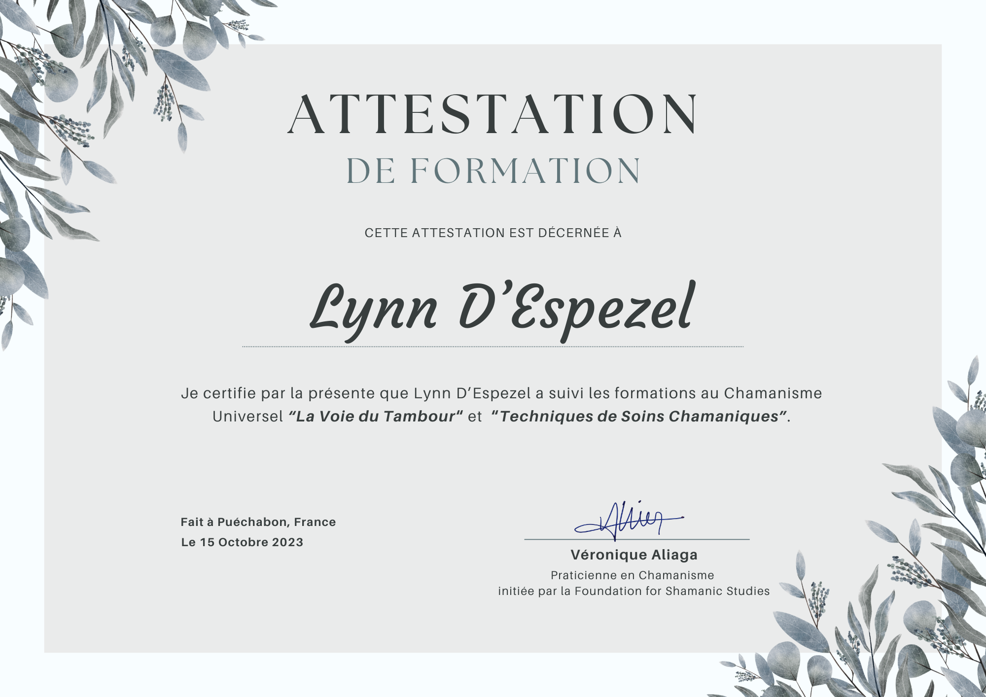 - Octobre 2023 : Certificat d’Aptitude en Chamanisme Universel ou Agrément en Soins de Chamanisme Universel (Terre de Guérison)